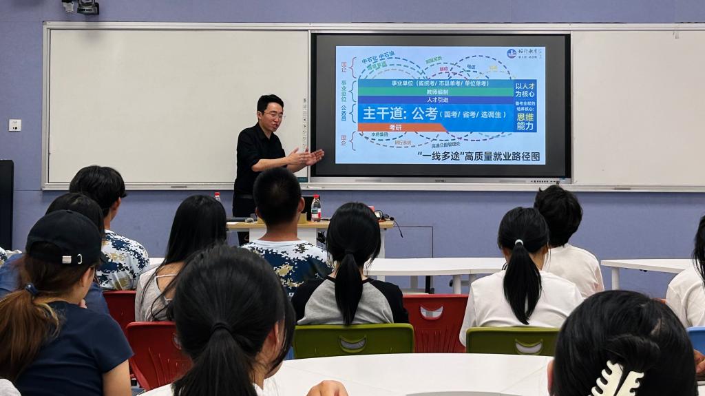 结合英国威廉希尔唯一官网各专业特点与当前就业趋势,祝老师深入剖析了未来的就业前景,强调了尽早树立就业目标、科学进行职业规划的重要性。他通过“一线多途”高质量就业路径图,细致讲解了各类公招考试不同方向的选择策略与准备要点。依托其在公考培训领域的多年积淀,祝老师分享了诸多独到见解,并指出,无论是选择哪条路径,思维能力的持续锻炼与提升都是实现高质量就业的核心竞争力。