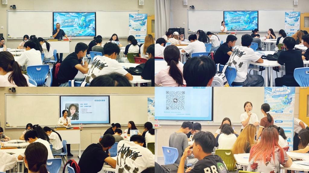 随后,杭州银行台州分行人力资源部负责人蔡晓芬系统介绍了杭州银行的发展历程、核心业务、企业文化及校招流程。她指出,杭州银行近年来发展稳健、氛围融洽,为员工提供具有竞争力的薪酬福利与完善的培训机制。同时,银行为应届生设计了清晰的职业发展路径,从多维度助力新人快速融入、持续成长。