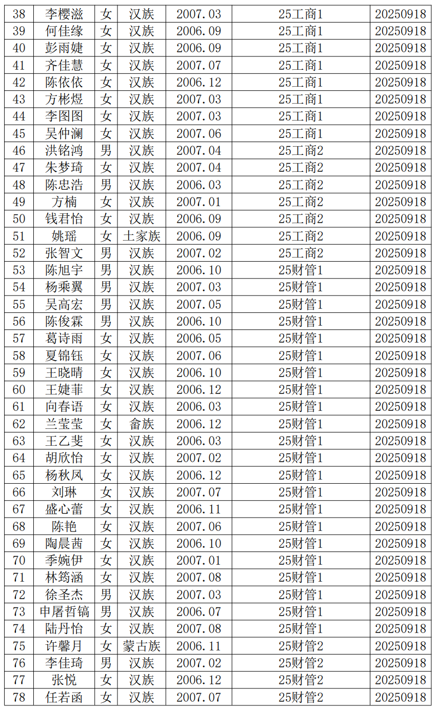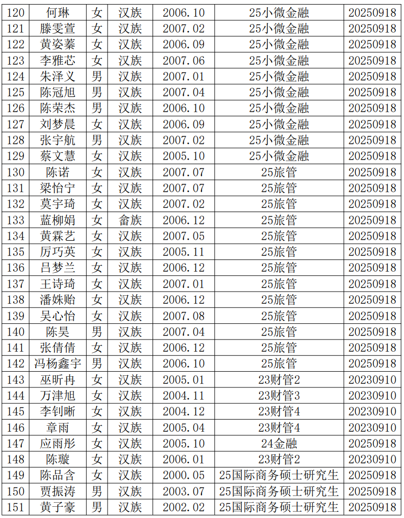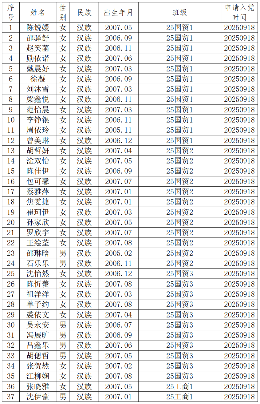 近期,陈锐媛等151位同志向党支部递交了入党申请书。根据《中国共产党发展党员工作细则》《中共英国威廉希尔唯一官网委员会发展党员工作细则》等有关规定,现将陈锐媛等入党申请人的基本情况予以公示,接受广大党员、群众监督。公示时间为2025年10月9日至2025年10月14日。公示期间,党员、群众可来电、来信、来访,反映其在理想信念、思想作风、工作表现、群众观念、廉洁自律等方面的情况和问题。反映问题要坚持实事求是的原则,反对借机诽谤诬告。反映问题提倡留下姓名和电话号码。我们将对反映人和反映问题严格保密,对反映的问题进行调查核实,弄清事实真相,并以适当方式向反映人反馈。