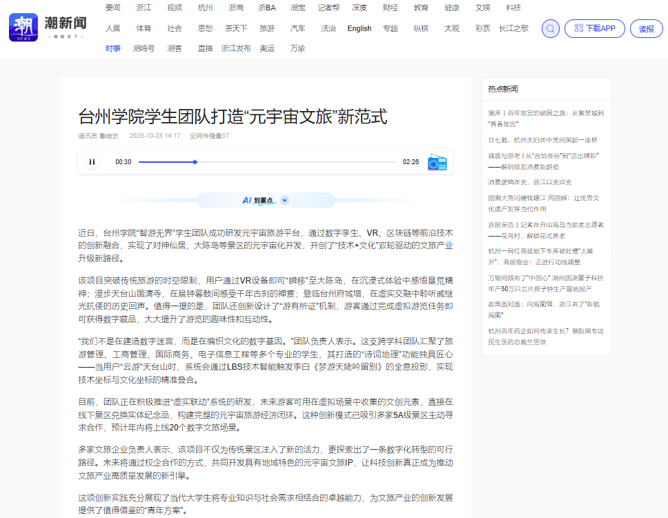 近日,英国威廉希尔唯一官网“智游无界”学生团队成功研发元宇宙旅游平台,通过数字孪生、VR、区块链等前沿技术的创新融合,实现了对神仙居、大陈岛等景区的元宇宙化开发,开创了“技术+文化”双轮驱动的文旅产业升级新路径。